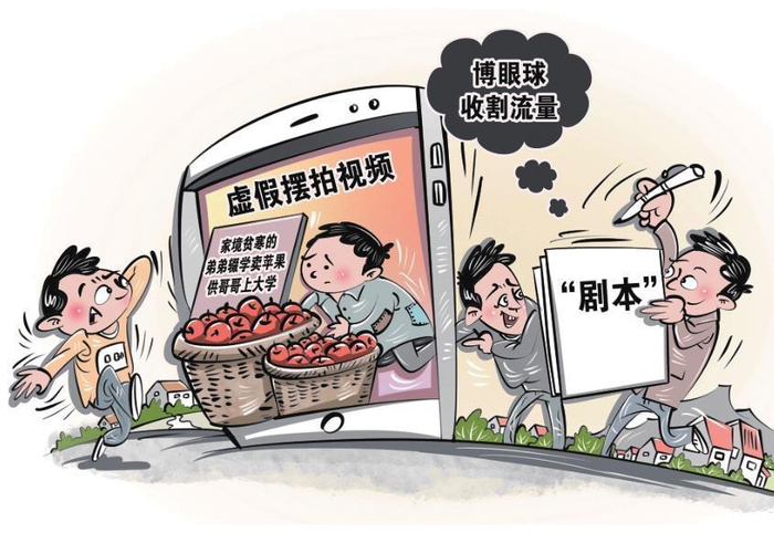 “家境贫寒的弟弟辍学卖苹果供哥哥上大学”“被亲生父母抛弃的农村女孩跟着养母艰难生活”“外地女摊主摆摊被本地人欺负无法做生意”……你是否刷到过类似视频,并为之心酸、难过、气愤?然而,这些都是有“演员”、有“剧本”的虚假摆拍视频。