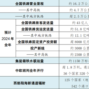 预计2024年全年全国铁路固定资产投资完成超8000亿元,投产新线约3000公里,其中高铁约2300公里;全国铁路营业里程约16.2万公里,其中高铁约4.7万公里,地方铁路超2.5万公里;预计全年全国铁路旅客发送量约43亿人,同比增长11.7%左右;全国铁路货运发送量约51.8亿吨,同比增长3%左右……刚刚召开的全国铁路监督管理工作会议上,一组组数据、一项项成就,引发与会人员广泛讨论和深刻共鸣。