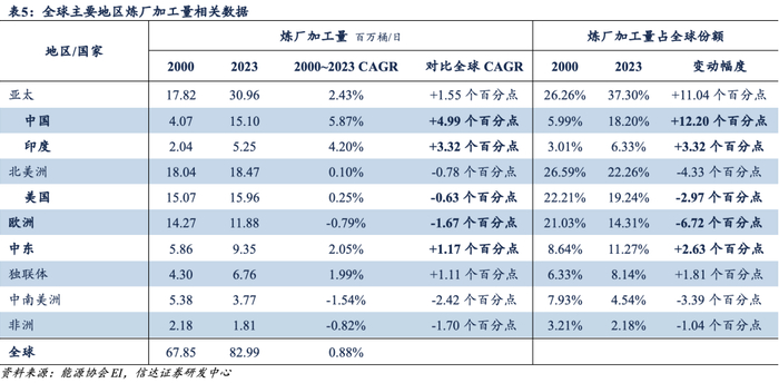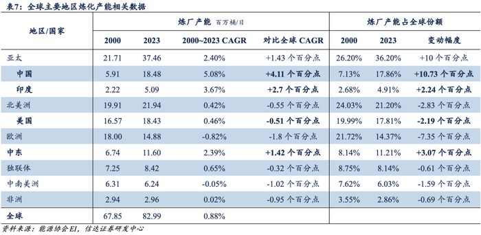 原油炼化的重心逐步向亚太、中东转移:在2000年,北美洲、亚太、欧洲为全球原油需求核心地区,三者分别贡献全球炼厂加工量26.59%、26.26%、21.03%的比重。随着经济全球化加深,亚太、中东地区国家的经济高增带动原油需求增速领先全球,2000~2023年,亚太炼厂加工量占全球比重增长11.04个百分点至37.30%,中东炼厂加工量占全球比重增长2.63个百分点至11.27%。