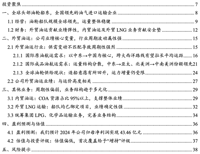 全球头部油轮船东,全国领先的油气进口运输企业。中远海运能源运输股份有限公司(中远海能600026.SH / 1138.HK)于2016年完成重大资产重组后主营国际和中国的沿海原油及成品油运输,以及国际液化天然气(LNG)运输,油轮船队运力规模世界第一,LNG船舶规模全国领先。截至2024年三季度末,公司拥有油轮运力156艘,合计运力2302万载重吨。分业务看,公司外贸油运业绩周期弹性强,内贸油运、外贸LNG运输业务整体稳健。