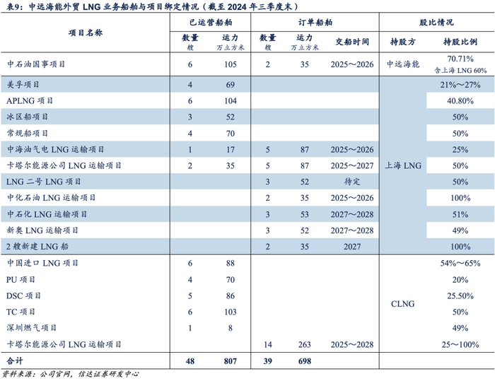 LNG运输:公司全资子公司上海LNG和参股50%的CLNG均为国内领先大型LNG运输公司。截至2024年三季度末,公司共参与投资87艘LNG船舶,均为签署长期期租合同的项目船,其中已投运48艘,合计运力807万立方米。