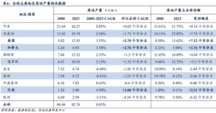 原油产量:中东维持主要份额,美国、巴西产量逐步扩张。2023年,全球原油产量实现82.76百万桶/日,同比增长1.69%,2000~2023年CAGR为0.83%。
