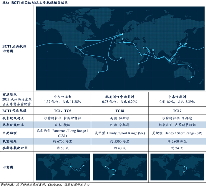 对应成品油航运航线:关注TC1、TC5、TC18、TC17航线。从波罗的海成品油运输指数BCTI成份来看,中东→亚太路线主要对应TC1、TC5航线,北美洲→中南美洲主要对应TC18航线,中东→非洲路线主要对应TC17航线。