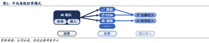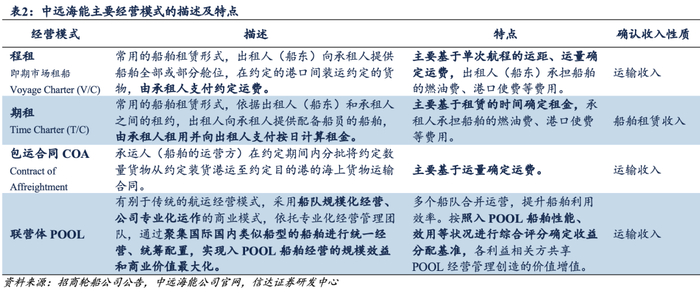 公司经营模式:以船舶租赁的形式为主,包括程租、期租、包运合同COA、参与联营体POOL运营等。其中,采用程租、包运合同COA及联营体POOL经营模式确认的收入为运输收入,采用期租经营模式确认的收入为船舶租赁收入。