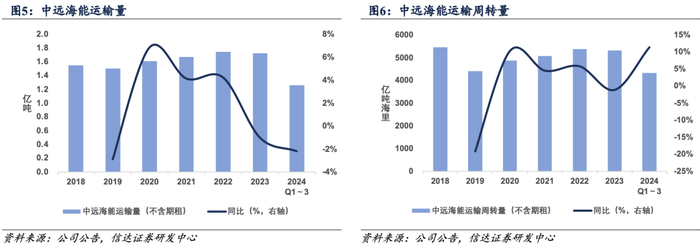 运输量与运输周转量整体稳健。2023年,公司实现运输量(不含期租)1.73亿吨,同比下滑1.02%,2020~2023年CAGR为2.42%;实现运输周转量(不含期租)5304.9亿吨海里,同比下滑1.17%,2020~2023年CAGR为2.96%。2024年前三季度,公司实现运输量(不含期租)1.26亿吨,同比下滑2.2%;实现运输周转量(不含期租)4325亿吨海里,同比增长11.3%。