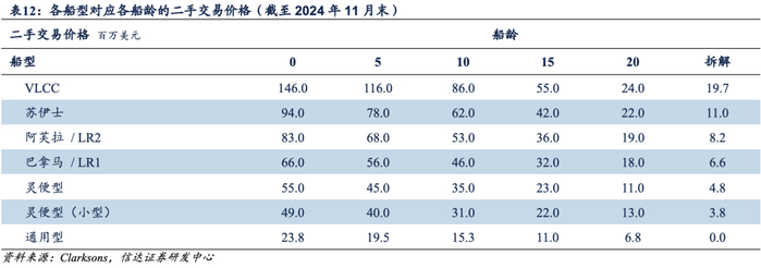 新签订单意愿基于高运价的持续性,现阶段行业造船意愿回升:在高运价持续的2003~2008年,行业新签订单较积极;而在高运价持续时间较短的阶段,船东倾向于使用二手油轮应对需求,推动二手油轮价格上行。俄乌、红海等地缘冲突的影响下,本轮高运价的持续性已带动行业造船意愿回升,油轮行业在手订单占运力比重已从2022年1月的7.50%提升至2024年9月的12.93%。
