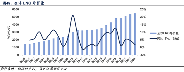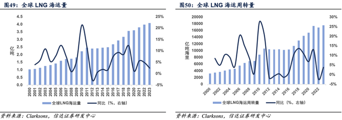 外贸LNG市场需求稳增。全球LNG外贸量在2023年实现5487.07亿立方米,同比增长1.75%,2000~2023年CAGR为6.10%。LNG外贸量稳增的背景下,2023年,全球LNG海运量实现4.08亿吨,同比增长2.43%,2000~2023年CAGR为6.19%;全球LNG海运周转量实现17506.09亿吨海里,同比增长3.71%,2000~2023年CAGR为7.65%。
