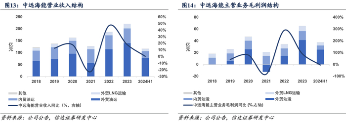 外贸LNG运输并表业务净利润:在2023年实现-11.64亿元,主要系产生资产减值损失9.84亿元、信用减值损失2.03亿元;在2024年上半年实现0.37亿元,同比下滑38.36%。