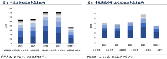 外贸LNG运输业务营业成本结构:折旧费、船员费、修理费合计占比稳定在80%以上,在2023年的占比分别为45.56%、18.76%、17.77%,合计占比82.09%;在2024年上半年的占比分别为54.72%、25.32%、23.08%,合计占比103.11%。