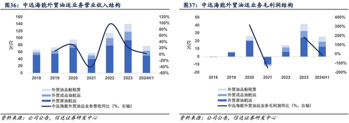 外贸油运:营收及毛利润具备周期性波动性质。2023年营收实现140.05亿元,占公司营收63.40%;毛利润实现41.48亿元,占公司主营业务毛利润63.82%。2024年上半年营收实现77.53亿元,占公司营收66.55%;毛利润实现25.35亿元,占公司主营业务毛利润67.69%。