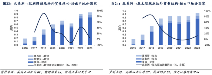 北美洲→欧洲路线中,美国出口路线2023年实现原油外贸量0.80亿吨,2016~2023年CAGR高达53.51%,超北美洲→欧洲路线水平27.74个百分点,超出全球水平53.45个百分点,占北美洲→欧洲路线原油外贸量的比重从2016年的20.94%提升至2023年的84.51%,占全球原油外贸量的比重从2016年的0.19%提升至2023年的3.78%。
