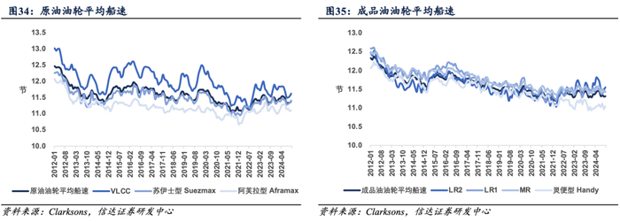 重要因素:环保监管趋严导致船速受限。2020年起,国际海事组织IMO对温室气体排放的相关政策出台趋于频繁,在2021年发布船舶技术能效指数EEXI、船舶碳排放强度指标CII,并于2023年起正式实施。其中,EEXI对船舶的温室气体排放水平提出限制,且限制随着时间逐步收紧;CII对船舶的碳排放强度进行评级,并要求船舶碳排放水平持续改善。根据IMO建议,限制动力降低船速对现有船舶而言可直接实现减排目标。2020年~2024年10月,原油油轮平均船速下滑3%,其中VLCC平均船速下滑7%,成品油轮平均船速下滑1%。