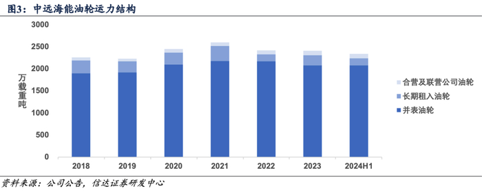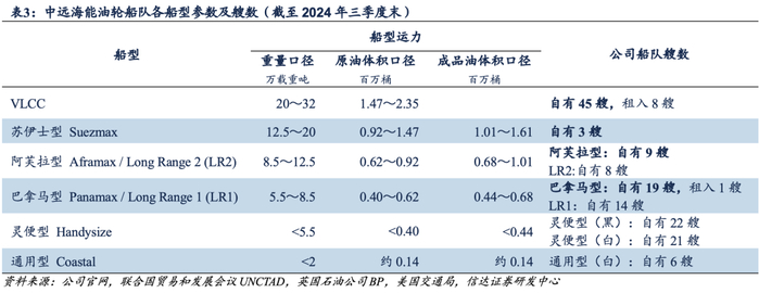 油品运输:公司油轮船队运力规模世界第一,且全球船型最齐全。截至2024年三季度末,公司拥有油轮运力156艘,合计运力2302万载重吨。分船型看,公司VLCC、苏伊士型、阿芙拉型、巴拿马型自有船舶数分别为45、3、9、19艘。
