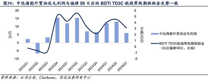 公司外贸油运业务毛利润高度挂钩TD3C航线运价水平。截至2024年三季度末,公司运营油轮156艘,其中VLCC达45艘,为公司油轮船队最主流的船型。考虑到中东→亚太路线的原油航运量在全球原油外贸量的比重稳定在30%~35%区间,其对应航线TD3C为VLCC主流航线。考虑到程租模式在货物运输完成后确认收入,而TD3C单航次时间约50天,我们将TD3C运价向后偏移50日后,对比公司外贸油运业务毛利润水平,二者整体走势一致。