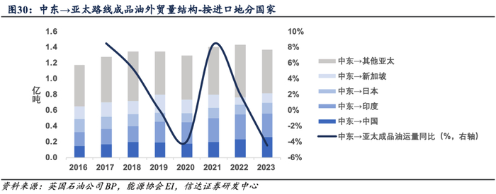 中东→中国路线:2023年实现成品油外贸量0.26亿吨,2016~2023年CAGR为8.30%,超中东→亚太路线水平6.14个百分点,超全球成品油外贸量水平6.93个百分点,占中东→亚太路线成品油外贸量的比重从2016年的12.70%提升至2023年的19.11%,占全球成品油外贸量的比重从2016年的1.36%提升至2023年的2.16%。