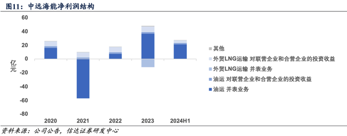 净利润拆分:油运业绩主要来自并表业务,外贸LNG运输业绩主要来自投资收益。2023年,公司实现净利润36.60亿元,同比增长105.05%,2020~2023年CAGR为11.75%;2024年上半年,公司实现净利润27.70亿元,同比下滑7.69%。分业务看: