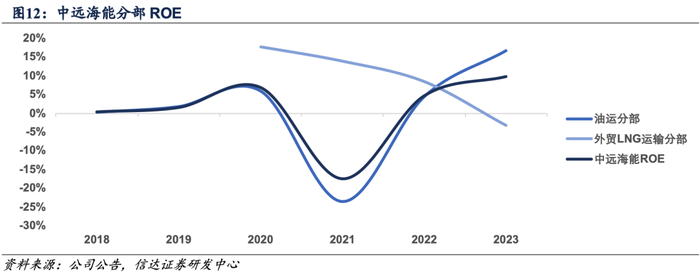 分业务ROE对比:油运分部ROE表现出较强的波动性。公司ROE在2023年实现9.74%,历史波动主要来自油运分部。分业务看,油运分部ROE在-25~20%的范围内波动,2023年实现16.76%;外贸LNG运输分部ROE在2020~2021年于15%附近波动,2023年受资产减值与信用减值影响落至-3.29%。