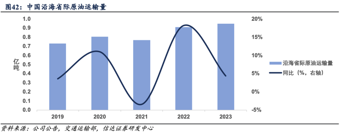 内贸原油航运需求:公司内贸原油航运主营海洋原油一程、进口原油国内中转,需求主要基于海洋原油产量以及原油进口量,二者整体维持稳健。2023年,全国海洋原油产量实现0.62亿吨,同比增长5.8%,2020~2023年CAGR为6.07%;全国原油进口量实现5.64亿吨,同比增长11%,2020~2023年CAGR为1.31%。需求稳健支撑下,全国沿海省际原油运输量实现0.95亿吨,同比增长4.4%,2020~2023年CAGR为5.57%。