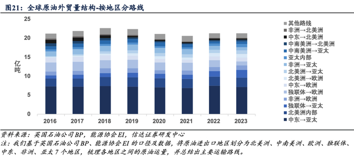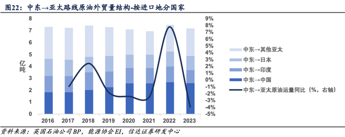 中东→亚太路线:中国为核心进口地。按进口地分国家看,中东→亚太路线中,中东→中国路线2023年实现原油外贸量2.61亿吨,2016~2023年CAGR为5.12%,超中东→亚太路线水平5.39个百分点,超全球水平5.06个百分点,占中东→亚太路线原油外贸量的比重从2016年的25.17%提升至2023年的36.37%,占全球原油外贸量的比重从2016年的8.69%提升至2023年的12.28%。