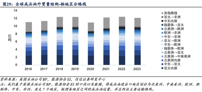 2.1.2 国际成品油航运需求:运量结构分散,中东→亚太、北美洲→中南美洲份额领先