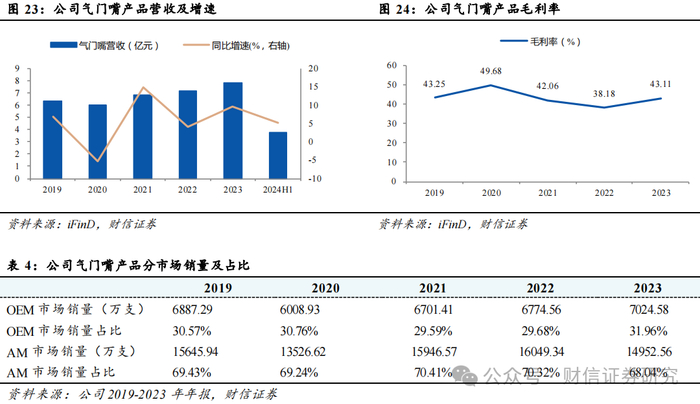 新兴业务快速放量,境内、OEM市场营收占比稳步提升。分地区来看,剔除非主营业务收入后,2019-2023年公司主营业务境外收入占比一直维持在50%以上,但随着空气悬架、传感器等新兴业务持续放量,公司境内营收占比稳步提升,2024H1已实现对境外收入的反超,境内营收占比提升至50.61%。随着新兴业务订单持续投产,公司主营业务境内业务占比有望继续提升。公司产品按照市场划分可分为OEM整车配套市场及AM售后维修服务市场,公司气门嘴和TPMS产品同时针对OEM和AM市场,其中气门嘴产品以AM市场为主,2023年AM市场销量占比达68.04%,其余产品主要集中在OEM市场。随着新兴业务持续放量,公司OEM市场占比稳步提升。2024H1公司OEM市场、AM市场营收占比分别为79.70%、18.60%。