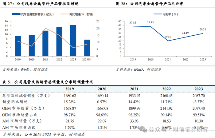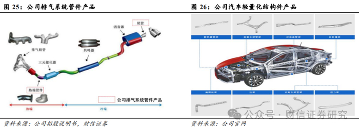 中国最大排气系统管件OEM供应商之一,金属加工业务拓展至汽车轻量化产品。公司汽车金属管件业务主要包括排气系统管件、EGR管件、车顶架和轻量化底盘与车身结构件等。公司于2001年开始研制排气系统管件,目前是中国最大的排气系统管件OEM供应商之一,生产的产品主要为排气装饰尾管及热端管。基于排气系统管件积累的液压成型技术等金属加工经验,公司成功拓展出车顶架及汽车轻量化产品。目前公司汽车金属管件业务营收中,排气系统管件业务占比最大,但从业务成长性来看,排气系统管件业务成长性较差,汽车轻量化产品未来预计将成为公司业绩新增长点。