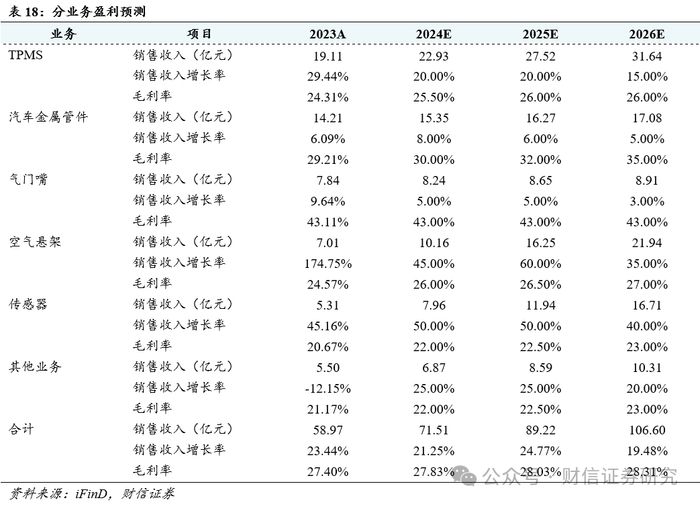4)空气悬架业务:随着国产化加速+配套车型价格下探,公司先发优势显著,在手订单逐步落地后营收将保持较快增长。预计2024-2026年营收增速分别为45%/60%/35%。
