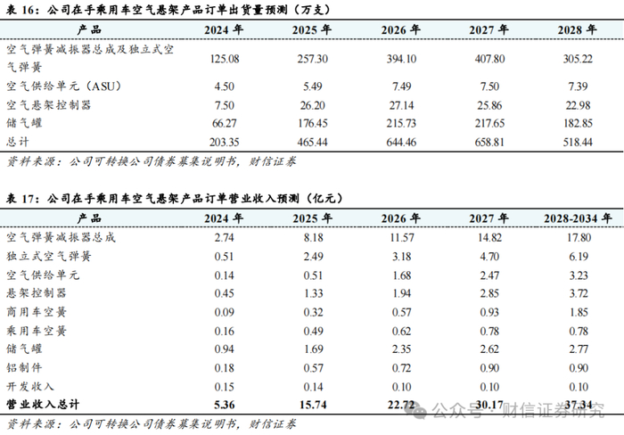公司在手订单充分,空气悬架业务未来将成为公司业绩最大增长点。根据公司在可转债募集说明书中披露的数据,截至2024年8月31日,公司共获得10个主机厂的23个空气弹簧减振器总成及独立式空气弹簧项目定点,2个主机厂的5个悬架控制器项目定点,2个主机厂的3个空气供给单元(ASU)项目定点,以及17个主机厂及一级零部件供应商的48个储气罐项目定点。根据主机厂提供的产量预测,2027年公司在手订单预计进入高峰释放年份,预计当年出货空气弹簧减振器总成及独立式空气弹簧408万支,储气罐等其他产品251万支。营收方面,若所有项目按照主机厂规划的生产曲线顺利爬坡,预计2024年将为公司贡献营收增量5.36亿。2027年预计营收增量为30.17亿元,是2023年营业收入的4倍。未来随着在手订单不断转化,空气悬架业务将成为公司业绩最大的增长点。