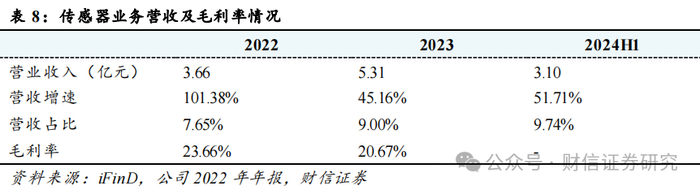 公司传感器业务增长迅速,部分细分领域已建立领先优势。自2022年单独披露传感器业务营收以来,2022、2023年及2024H1公司传感器营收分别为3.66、5.31及3.10亿元,同比分别增长101.38%、45.16%及51.71%,营收保持高速增长。受业绩高速增长推动,传感器营收占比从2022年的7.65%提升至2024H1的9.74%。毛利率方面2023年仅为20.67%,低于公司整体毛利率,未来随着销量不断增长形成规模效应后,毛利率预计将逐步提升。根据公司公众号披露的数据,公司在部分细分领域如轮速、光雨量、电流传感器等已在国内市场建立领先优势,预计2022年轮速传感器出货1500万只,光雨量传感器150万只,磁通门电流传感器30万只,下一步公司将基于优势细分领域继续扩大领先优势。未来随着国产替代过程的推进,公司传感器业务具有广阔的增长空间。