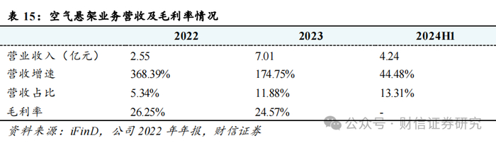 营业收入高速增长,营收占比持续提升。自2022年单独披露空气悬架业务营收以来,2022、2023年及2024H1公司空气悬架营收分别为2.55、7.01及4.24亿元,同比分别增长3.68倍、1.75倍及44.48%,营收保持高速增长。受业绩高速增长推动,营收占比从2022年的5.34%提升至2024H1的13.31%,营收占比大幅提升。毛利率方面2023年为24.57%,低于公司整体毛利率,未来随着销量不断增长形成规模效应后,毛利率预计将逐步提升。