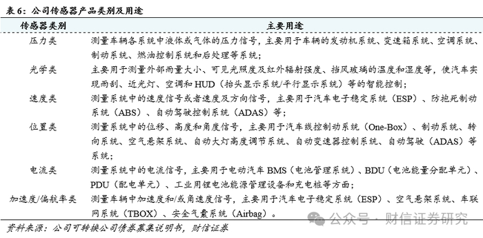 汽车计算机系统关键输入装置,可分为车身感知传感器和环境感知传感器。汽车传感器是汽车计算机系统的关键输入装置,由敏感元件、转换元件、转换电路和辅助电源组成。在汽车运行过程中,汽车传感器实时采集车身状态(如压力、加速度、温度等)及环境信息,并将采集的信息转换为电信号传输至汽车的中央控制单元。根据应用目的不同,汽车传感器可分为车身感知传感器和环境感知传感器。车身感知传感器是车辆自身信息的核心感知元件,包括压力传感器、位置传感器、温度传感器、线加速度传感器、角加速度传感器、空气流量传感器、气体传感器等;环境感知传感器则专注于对车辆周围环境的感知与识别,主要包括激光雷达、毫米波雷达、超声波雷达、摄像头及红外传感器等。根据公司业务单元划分,车身感知传感器归属于传感器业务单元,而环境感知传感器被纳入智能驾驶产品业务单元。目前公司传感器业务包含压力类传感器、光学类传感器、速度类传感器、位置类传感器、电流类传感器、加速度/偏航率类传感器等六大品类产品。
