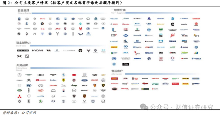 客户资源丰富,涵盖全球主要整车企业和Tier1客户。公司的主要客户包括全球和国内主要的整车企业。外资品牌和传统自主品牌客户方面如丰田、大众、奥迪、保时捷、现代起亚、宝马、奔驰、通用、福特、日产、本田、Stellantis、捷豹路虎、上汽、东风、长安、一汽、奇瑞、吉利、长城、赛力斯、江淮等;新势力客户方面:公司与蔚来、小鹏、理想、零跑、合众等建立了业务关系。Tier1客户方面:公司在全球范围内与大型的一级供应商如佛吉亚、天纳克、博格华纳、马瑞利、延锋、麦格纳、大陆、克诺尔、采埃孚、三五、布雷博等建立了稳定、长期的供货关系;售后客户方面:公司向北美和欧洲的知名独立售后市场流通商如Discount Tire、Tire Kingdom、ASCOT和伍尔特等供应产品。公司丰富的客户资源一方面体现了公司主要产品在行业的市场地位,另一方面有利于公司新产品的市场开拓。