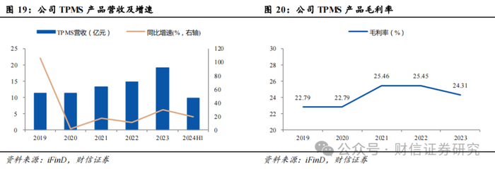 市场份额领先,传统业务营收稳步增长:公司传统优势业务TPMS、气门嘴及汽车排气系统管件市场份额均处于全球领先位置,营业收入保持稳步增长。2024H1三项业务合计营收占比为66.37%,是公司主要收入来源。受益于国产替代过程带来的前端营收增长及电池耗尽带来的后端市场需求增长,未来几年公司TPMS营收有望维持快速增长。