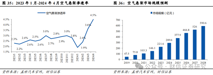 渗透率持续提升,未来市场空间广阔。随着配套车型不断增加,空气悬架渗透率持续提升。根据盖世汽车的数据,2023年空气悬架国内月度装载量呈现缓慢上升趋势,至12月份单月装载量接近7万台,渗透率已达2.8%;2024年渗透率涨势迅猛,4月渗透率增长至4.5%。据盖世汽车预测,2025年空气悬架渗透率将上涨到15%左右,市场规模接近380亿,年复合增长率达到41.3%,空气悬架未来市场空间广阔。