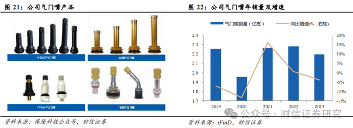 轮胎气门嘴全球最大供应商之一,气门嘴营收稳步增长。气门嘴营收稳步提升,根据公司官网介绍,公司是全球最大的轮胎气门嘴供应商之一,年均生产和销售气门嘴2.6亿只左右,市场份额位于全球前列。近几年来随着TPMS在乘用车上的广泛应用,TPMS气门嘴成为公司新的业务增长点。2019-2023年公司气门嘴营收从6.32亿元增长到7.84亿元,复合年增长率(CAGR)为+5.56%,收入占比从19.02%下降为13.30%。收入稳定增长,收入占比由于空气悬架、传感器等新业务放量小幅下降。毛利率方面,近几年公司气门嘴产品毛利率维持在40%左右,盈利能力较强。市场销量占比方面,AM市场销量稳定在70%左右,近两年由于TPMS气门嘴销量上涨,OEM市场销量占比有所提升。未来随着汽车保有量增长,公司气门嘴营收仍有望保持稳步增长。