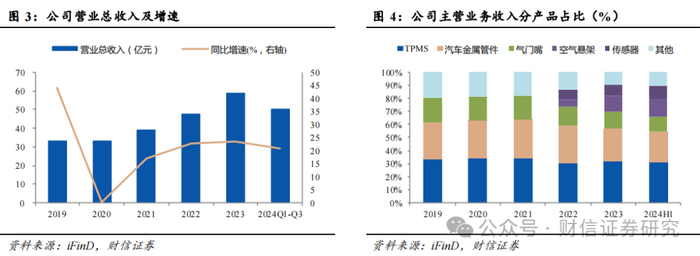 发展路径清晰,持续拓展汽车智能化、轻量化产品。公司成立于1997年,2017年上市,致力于汽车智能化和轻量化产品的研发、制造和销售。公司传统业务气门嘴、TPMS及汽车金属管件均处于行业领先地位。在不断巩固传统优势业务的同时,公司大力拓展车用传感器、空气悬架系统、智能驾驶产品等新兴业务。随着汽车智能化渗透率的提升及国产替代过程不断推进,公司空气悬架、传感器等新兴业务营收占比实现高速增长。2019-2023年公司总营收从33.21亿元增长到58.97亿元,复合年增长率(CAGR)为+15.44%。营收保持较快增长。随着空气悬架及传感器等新兴业务加速放量,公司业绩有望保持快速增长。