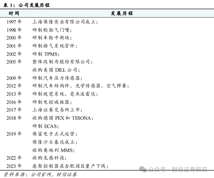 保隆科技前身是1997年成立的上海保隆实业有限公司,2005年改制为股份有限公司,2017年在上海证券交易所上市。公司的发展历程大致可分为三个阶段: