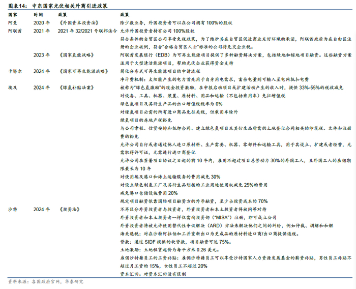 政策端积极提供便利,寻求光伏投资国际合作。沙特阿拉伯、开曼、阿联酋三个中东光伏巨头均在近年放开了对外籍法人持股比例的限制,意味着外国投资者现在可以在本土公司拥有100%的股权。除此之外,各国还采用了简化注册手续、本土员工补贴等手段吸引国际投资。埃及发布的《绿氢补贴法案》将国际融资方的外币融资占比超过70%作为可享受优惠政策的前提条件之一。