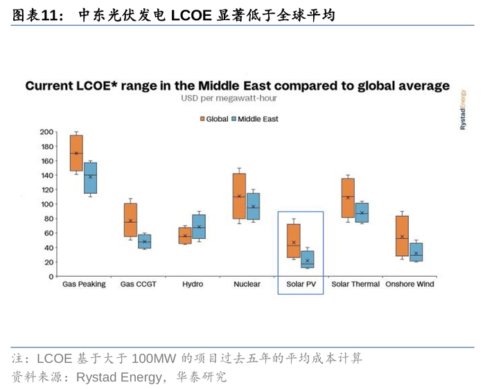 中东光伏度电成本显著低于全球平均。新兴市场项目建设成本普遍更低,叠加丰富的光照资源、广袤的土地资源,以及当地政府积极的补贴政策,中东地区度电成本显著低于全球平均。据Rystad Energy,全球光伏发电成本平均约42MWh,而中东国家平均仅为18MWh。