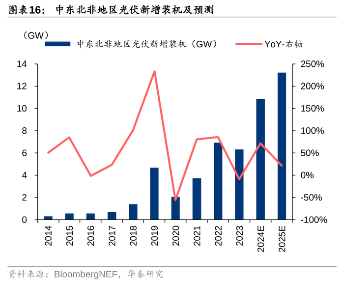 近三年中东北非地区装机复合增速超40%。根据世界能源统计年鉴,排除埃及与伊朗主要依靠水力,MENA地区整体光伏占可再生能源发电量比重为75%。根据BNEF统计,2023年中东北非光伏新增装机6.3GW,24/25年新增光伏装机或达到10.9GW/13.2GW,对应24-25年CAGR为44.6%。