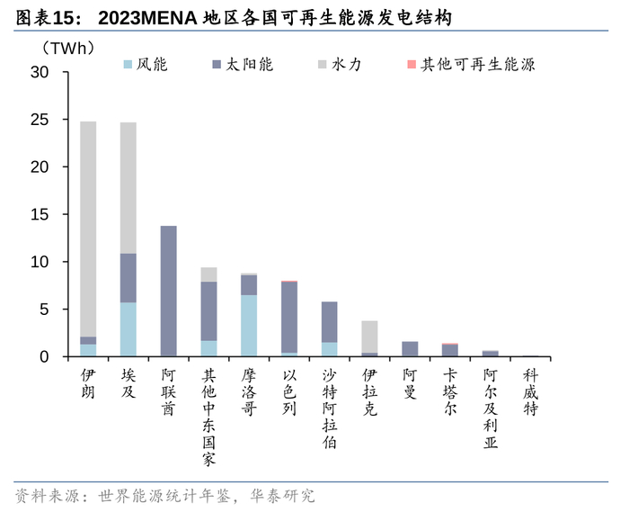 中东光照资源禀赋优越。中东地区以热带沙漠气候为主,年均光照强度超过2000kWh/m2,该地区接收的全部太阳能占地球太阳能资源的22%-26%,其中沙特年均光照强度高达2200-2400kWh/m2,阿联酋年均日照时间超过3500小时。在2023年电力需求超过10TWh的国家或地区中,平均阳光辐射量前二十的国家主要集中在中东地区。而以阿联酋、埃及、沙特为代表的中东国家坐落在发电潜力图的右下角,其平均阳光照射强度远高于其他国家,而光伏发电量占比不足5%,未来发展潜力较大。