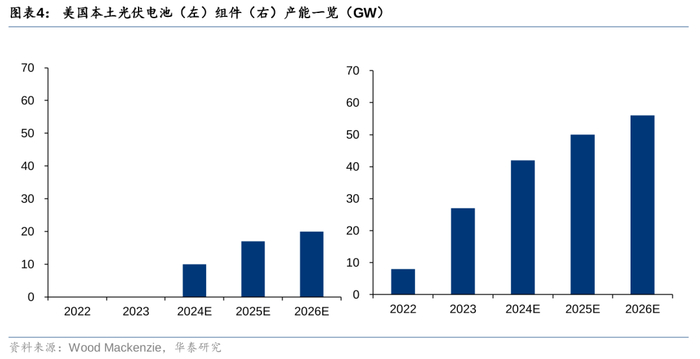 美国本土光伏产能仍有缺口。根据 Wood Mackenzie 数据,当前美国本土有 20GW 太阳能电池产能正在规划中,但相比 60GW 的需求,依然有40GW 的缺口。而这些产能至少需要两到三年的时间来建造和爬坡,因此短期内不太可能有产出,美国太阳能市场中长期产能缺口仍大。