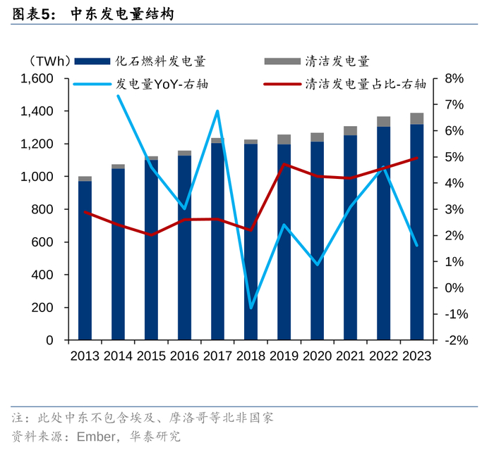 中东化石燃料依赖度高,光伏消费潜力较大。中东能源需求和经济发展高度依赖化石燃料,碳排放远超全球平均水平。根据Ember统计,中东地区用电量稳步增长,2019-2023年发电量复合增长率达2.5%,根据IEA及Rystad Energy,2024-2026年中东电力需求增长率将达3%,2050年需求达2000TWh。由于化石能源供应充足且价格便宜,能源结构中以化石能源为主,清洁能源发展仍处于起步阶段,2023年清洁能源的发电量占比仅为4.95%。高度依赖化石能源的结果是碳排放远高于全球平均水平。根据Ember统计,2023年中东地区平均度电碳排放为658g/kWh,远超全球480g/kWh的水平。