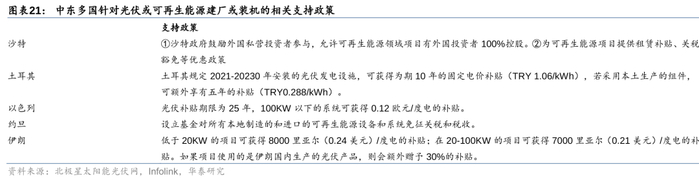 政府补贴:土耳其规定2021-20230年安装的光伏发电设施,可获得为期10年的固定电价补贴(TRY 1.06/kWh),若采用本土生产的组件,可额外享有五年的补贴(TRY0.288/kWh)。沙特方面同样有扶植本地开发商,放松对本地太阳能面板制造商的限制的相关政策。
