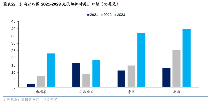 美发起双反调查前,中国光伏企业多选择在东南亚建厂输美。中国光伏企业为规避国内产能出口海外的贸易壁垒,之前多选择在成本较低的东南亚建厂绕道出口美国等海外高溢价市场,目前已在东南亚建立起完整的光伏产业链。根据美国商务部统计,柬埔寨、马来西亚、泰国、越南四国在2023年的光伏产品进口额分别为23.1亿美元、18.7亿美元、37.3亿美元、39.9亿美元,同比增加204%、107%、151%、57%。四国对美组件出口额在2023年均出现了超高幅度的增长。