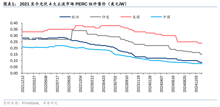在全球光伏产能过剩背景下,海外市场高溢价的来源是人为的关税贸易壁垒。美国、欧盟、印度等国家和地区均对中国光伏产品发起过“双反”调查、保障措施或关税壁垒。2011年以来,美国商务部对来自于中国大陆的晶硅光伏电池及组件发起“双反”调查,开始对相关光伏产品征收保证金。2022年印度政府决定对进口光伏组件/电池分别征收40%/25%的关税。2024年6月,美国政府宣布取消双面光伏组件的201关税豁免。人为的贸易壁垒抬高了美国/印度等国家的光伏组件售价,而相对进入门槛较低的欧洲市场,其光伏价格则被充分竞争到与国内光伏组件几乎持平的低价。