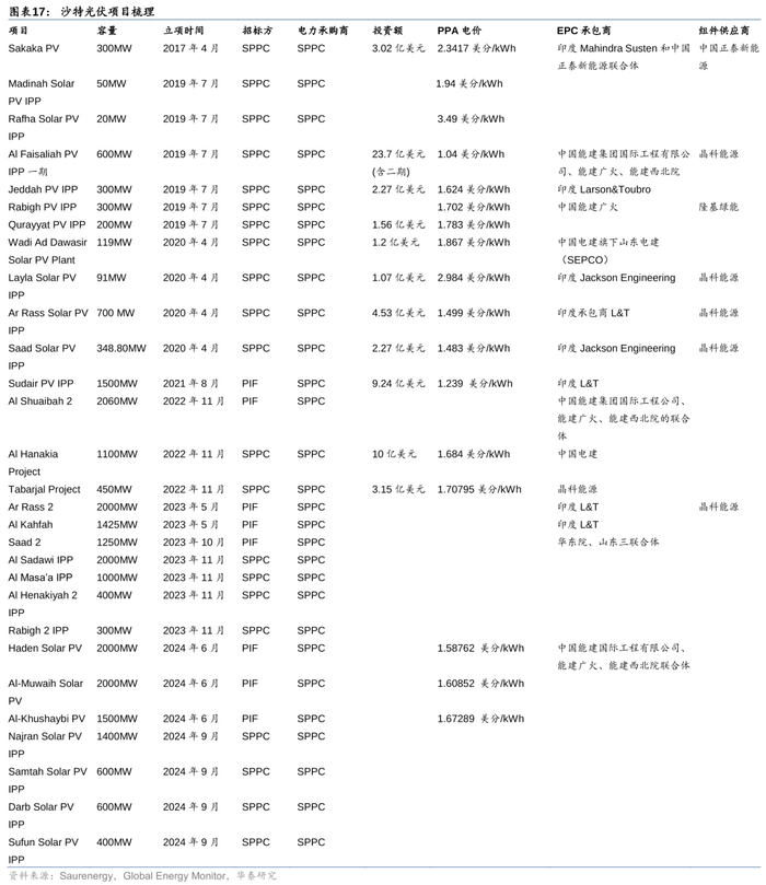 中国光伏产品加速进入中东,项目中标与产能布局持续推进。2022-2023 年,我国对中东和北非的光伏组件出口连续突破 10GW,尤其是沙特、阿联酋两个国家增长迅速。以沙特为例,我国2022年对该国的光伏组件出口额是 3.1 亿美元,后一年就达到 13.4 亿美元,沙特也成为中国组件第六大出口国。从已公布规模的产能来看,硅料产能15万吨,硅片产能50GW,电池片产能29GW,组件产能25GW,支架产能约8GW。