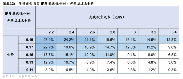 资源禀赋佳+光伏项目成本低。我们以沙特为例,对中东的光伏项目的IRR进行了测算。假设光伏每年有效利用小时数为2500h,光伏投资成本为2.8元/W,其中光伏组件成本为0.8元/W,项目使用年限为25年,光伏PPA电价为0.15元/kWh,无相关补贴,我们计算得到光伏项目的IRR为11%,经济性较好,未来有望进一步放量。