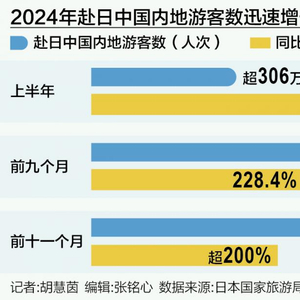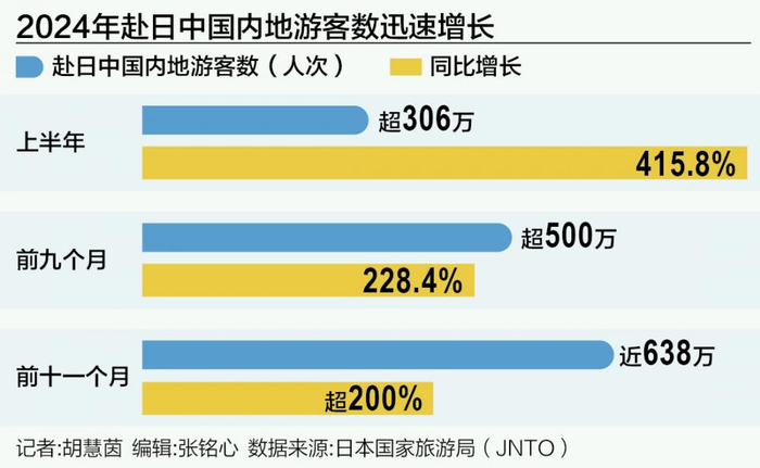 今年以来,赴日旅游的中国内地游客数量一直保持着高速增长。日本国家旅游局(JNTO)发布的数据显示,2024年上半年,有超过306万人次中国内地游客赴日旅行,较2023年同期增长415.8%;2024年前九个月,前往日本的中国内地游客总量超过500万人次,同比增长228.4%;2024年前十一个月,有近638万人次的中国内地游客入境日本,同比增长超过200%。整体来看,今年1—10月,中国内地游客占访日游客人数整体比例接近20%。