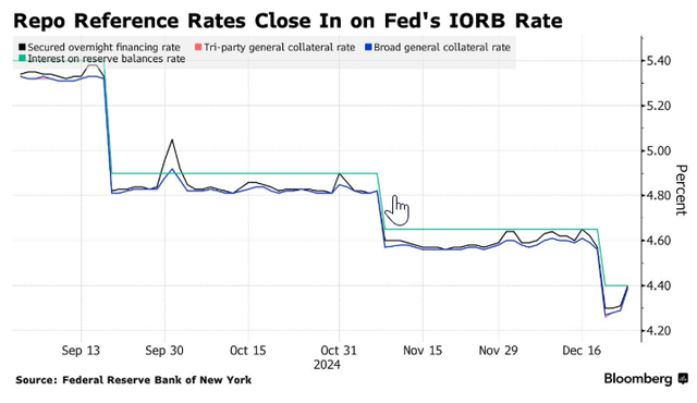 纽约联储周四公布的数据显示,截至12月24日,基于美国国债抵押回购市场的隔夜利率——担保隔夜融资利率(SOFR)从4.31%跃升至4.40%。这与4.40%的存款准备金率一致,表明银行年底对资产负债表的约束开始推高隔夜融资成本。